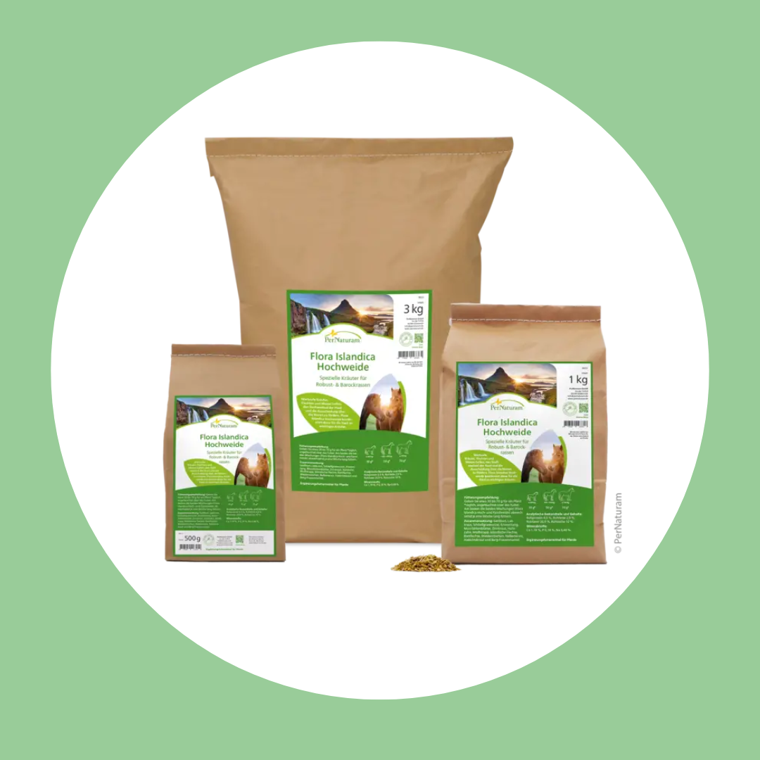 De kruiden en korstmossen — rijk aan mineralen — groeien op de zuivere, vulkanische bodems van IJsland. Flora Islandica ondersteunt deze rassen bij hun aanpassing aan de Midden-Europese flora, waar de grassen vaak energierijker zijn dan zij van nature gewend zijn.