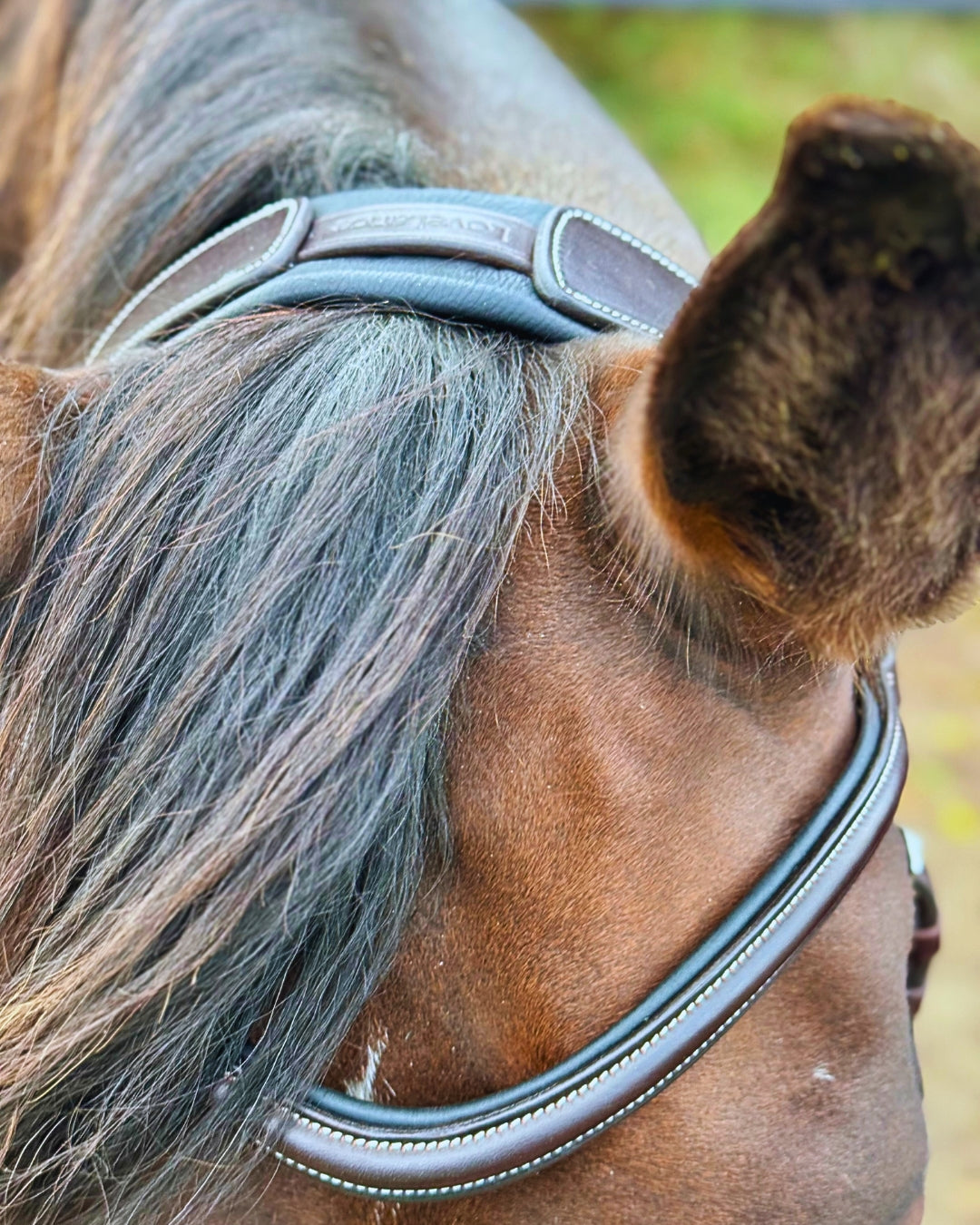 Het speciaal gevormde kopstuk is anatomisch ontworpen om druk gelijkmatig te verdelen en de atlas vrij te laten. De zachte onderlegde padding voorkomt wrijving en zorgt voor extra comfort. De brede neusriem volgt dezelfde gedachte: zacht en stevig in het midden, elegant en verfijnd aan de zijkanten – een perfecte balans tussen functionaliteit en design.