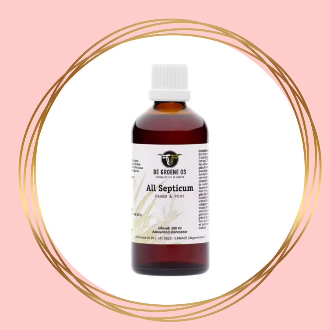 All Septicum is de superheld van het immuunsysteem! Het zorgt ervoor dat de gezondheid van je paard in topvorm blijft, zowel preventief als wanneer het last heeft van chronische klachten. Het beschermt de slijmvliezen in de bovenste luchtwegen, mondholte en maag-darmkanaal, zodat het paardenlichaam zich als een fort voelt.