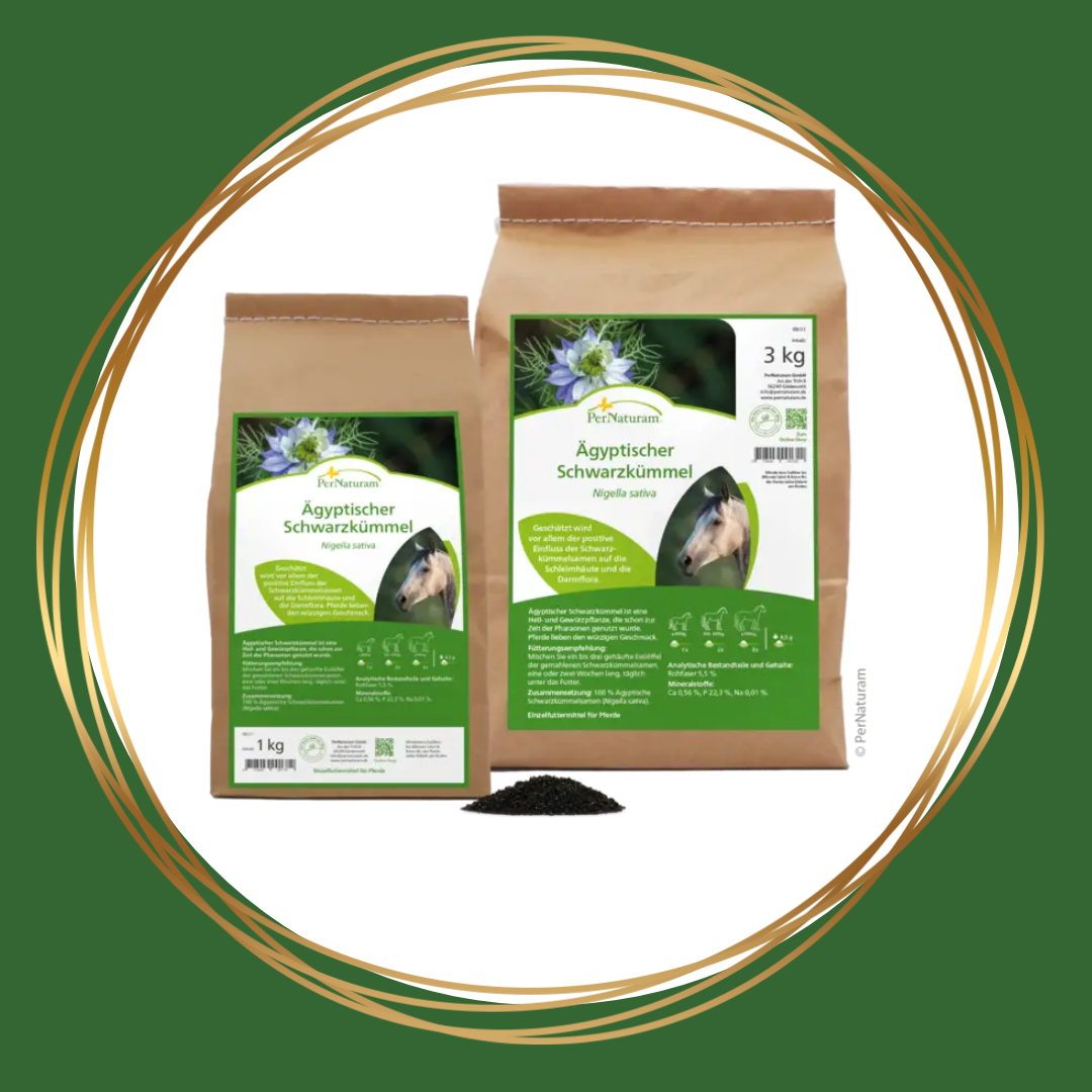 Sinds de tijd van de farao’s wordt Egyptische zwarte komijn gebruikt als krachtig geneeskrachtig kruid. Paarden zijn dol op de pittige smaak en profiteren van de positieve effecten op de slijmvliezen en darmflora.