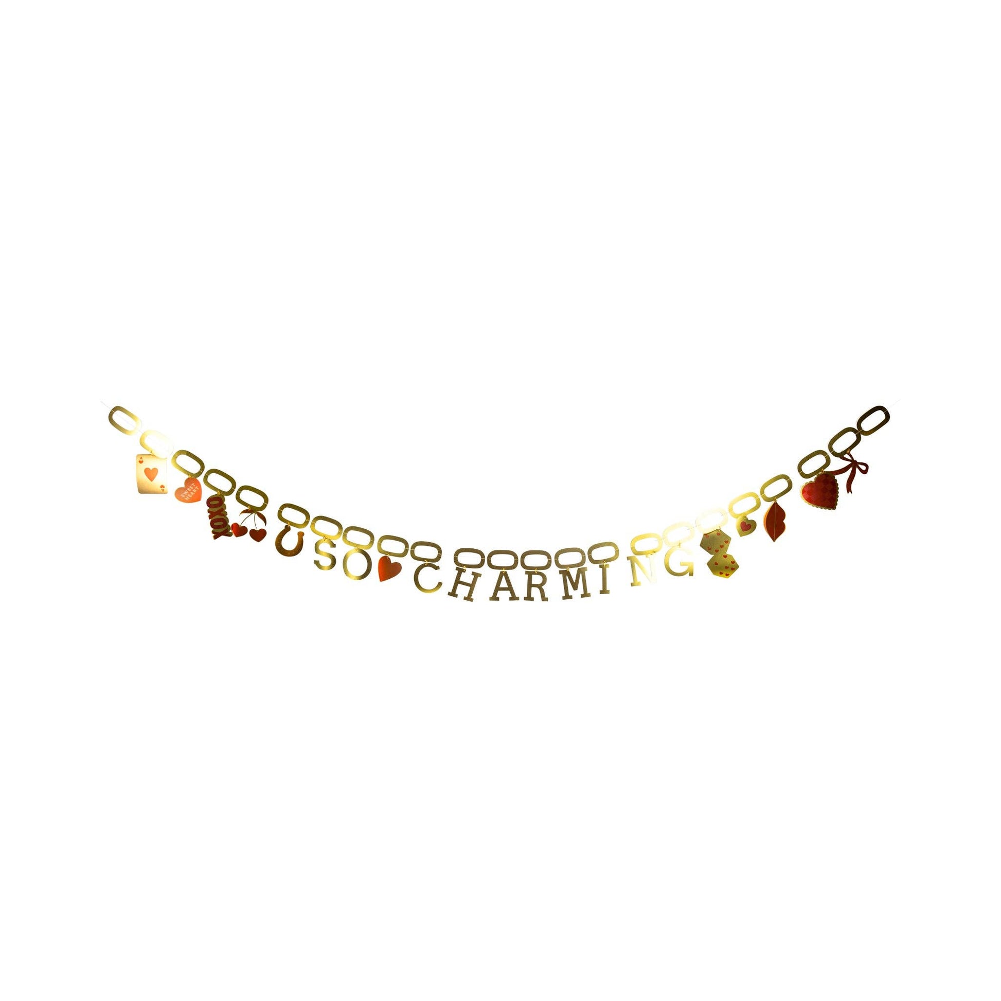 Vier liefde en charme met de So Charmed Banner—het perfecte statementstuk voor Valentijnsdag voor je feestlocatie! Deze heerlijke banner heeft speelse ontwerpen geïnspireerd op bedelarmbanden die elke viering een vleugje fantasie en romantiek geven. • SO CHARMED papieren banner - 7 ft • Goudfolie met rood en roze • "SO CHARMED" letters zijn 3,25" hoog • Bedeliconen zijn ca. 4" hoog