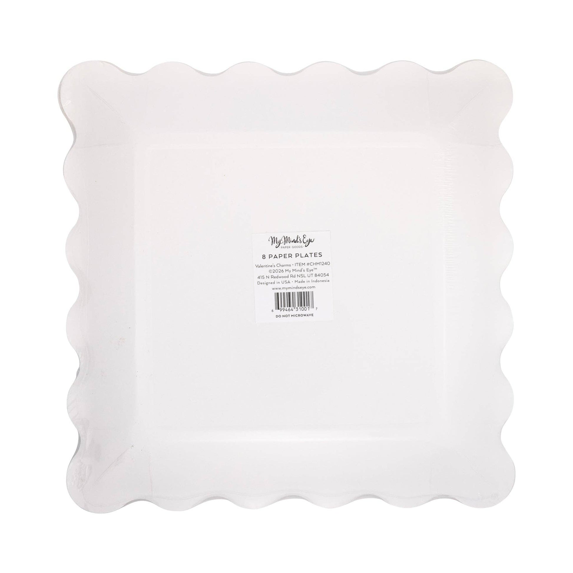 Verspreid de liefde met dit charmante Valentijnsdagbord! Met een betoverend bedelarmbandthema brengt dit 9" geschulpte vierkante bord een feestelijke flair naar elke viering. De elegante geschulpte randen voegen een vleugje verfijning toe, terwijl de speelse bedelmotieven het leuk en flirterig houden. • Roze, rood en crème bedelarmbandontwerp • Versierd met goudfolie details. • Bevat 8 geschulpte vierkante papieren borden • 9" x 9"