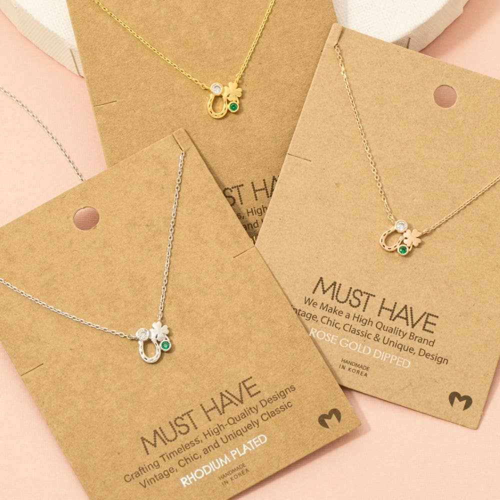 Deze trendy ketting heeft een modieuze goud gedompelde hoefijzerklaver en een hangerketting met cubic zirconia. Dompel jezelf onder in modefinesse met deze statement trendy ketting.