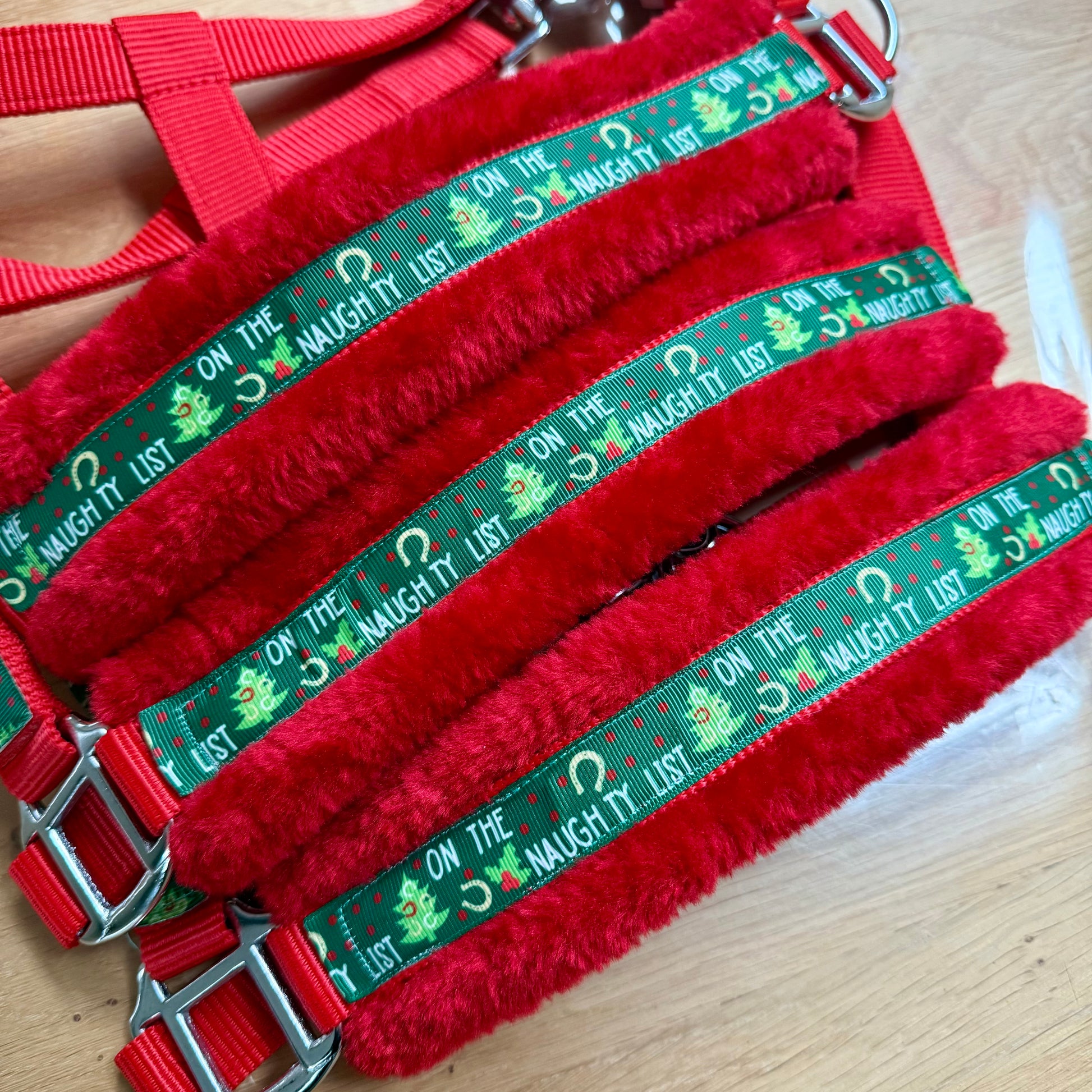 Is jouw paard wel lief geweest dit jaar? Of was het toch een boefje? Laat jouw paard stralen met dit vrolijke, handgemaakte halster in de kleur rood of zwart met speelse kerstprint! Dit unieke halster is niet alleen een echte blikvanger, maar ook ontworpen met oog voor comfort. De binnenzijde is heerlijk zacht onderlegd met bont, wat schuurplekken voorkomt en zorgt voor extra draagcomfort. Perfect voor dagelijks gebruik of om mee te pronken tijdens een fotoshoot. Een must-have voor elke paardenliefhebber die houdt van kleur én kwaliteit!