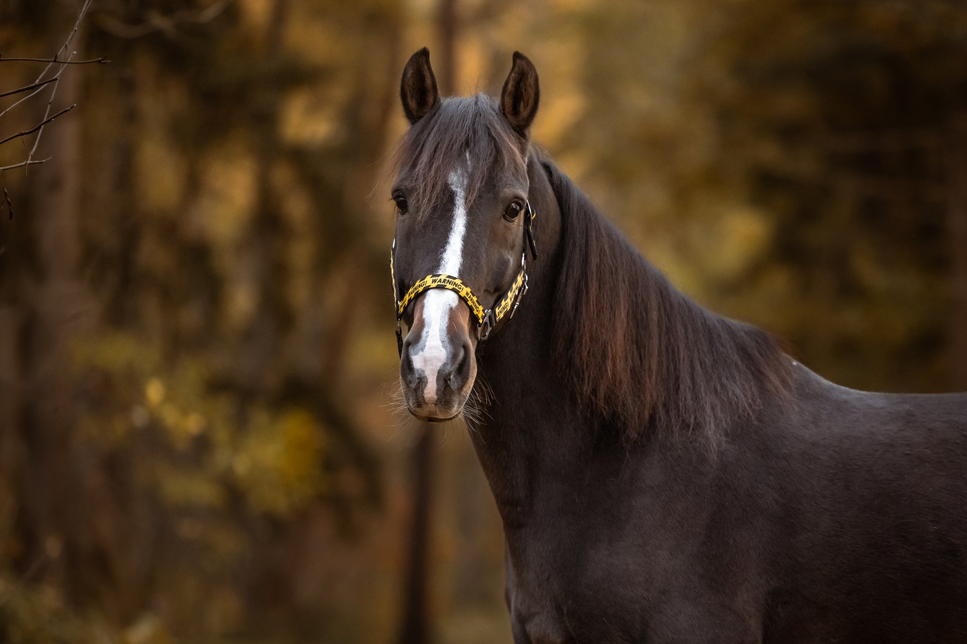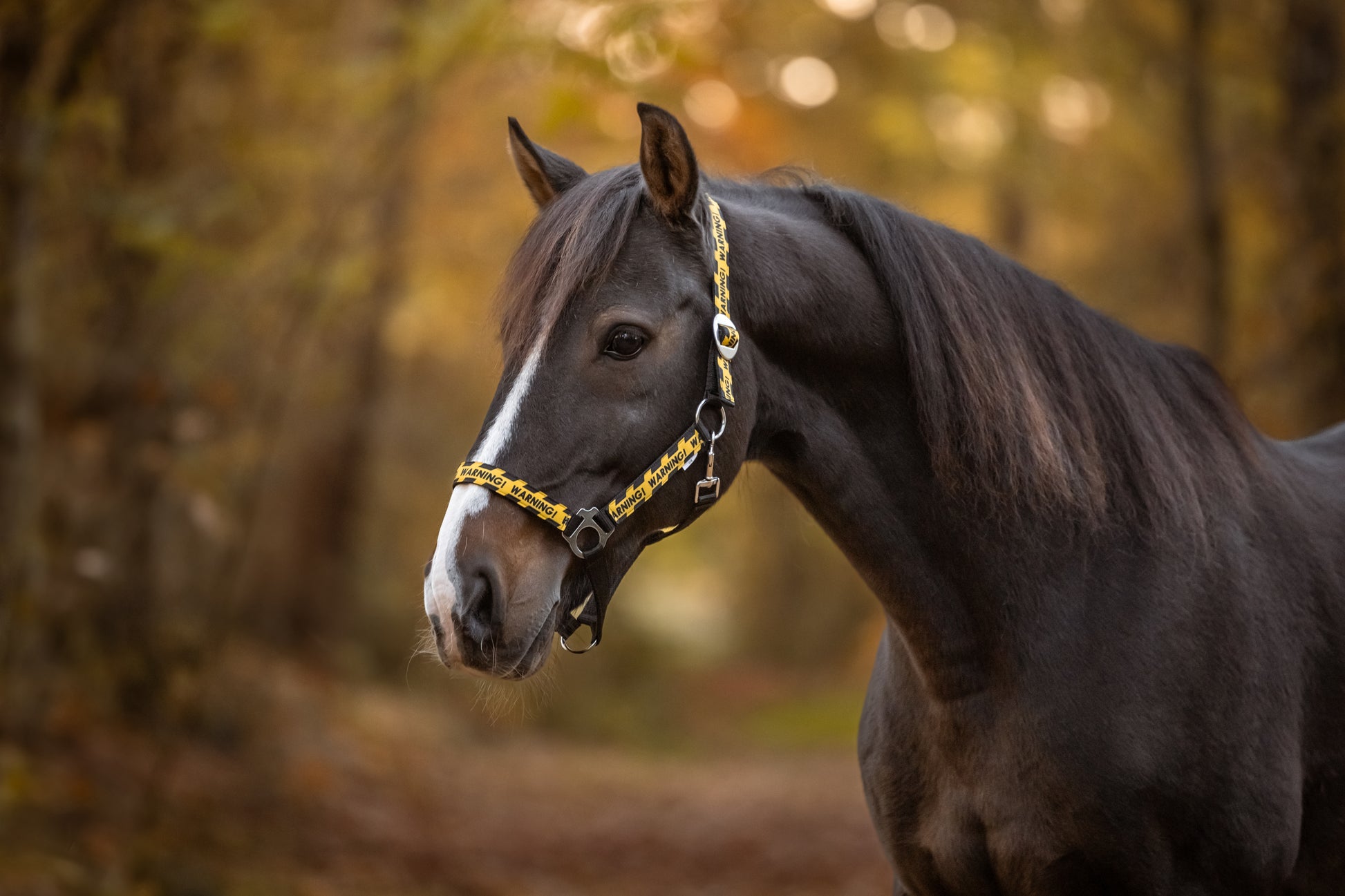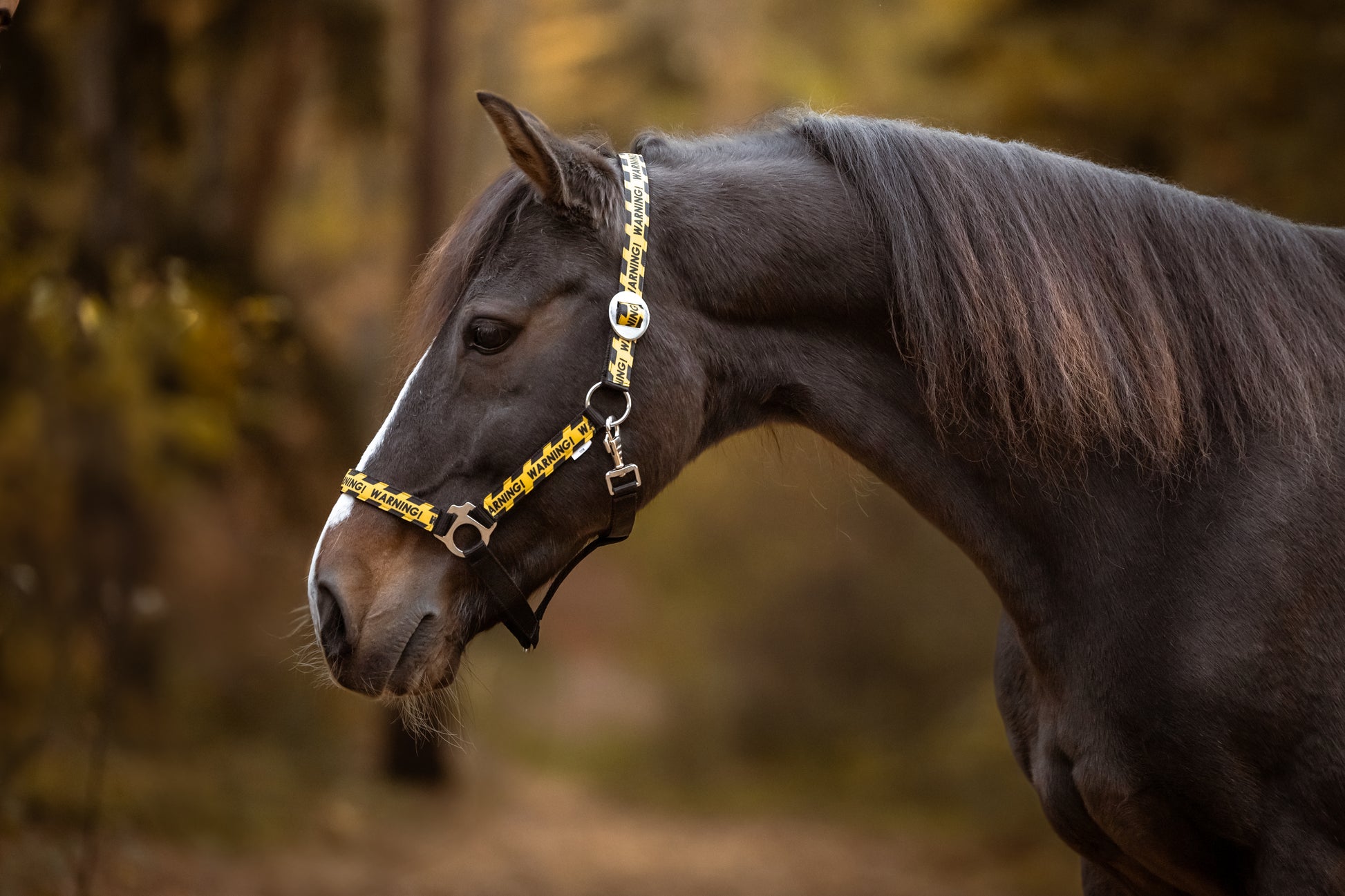 Warning! Laat jouw paard stralen met dit stoere, handgemaakte halster in de kleur zwart met speelse warningprint! Dit unieke halster is een echte blikvanger.