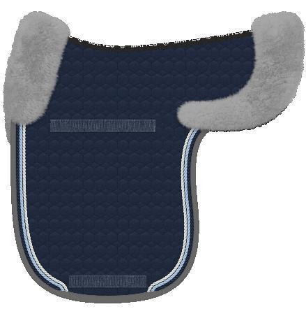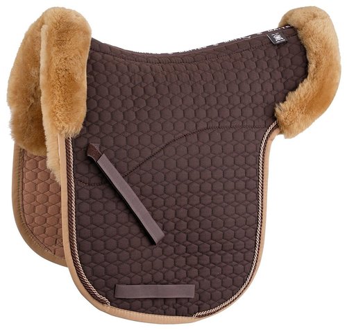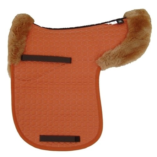 Zadelvormig katoenen dekje met lamsbont onder het zadelkussen. Met bontrand aan de voorkant en aan de achterkant.