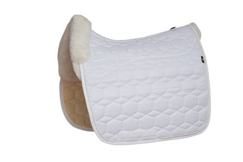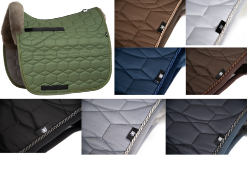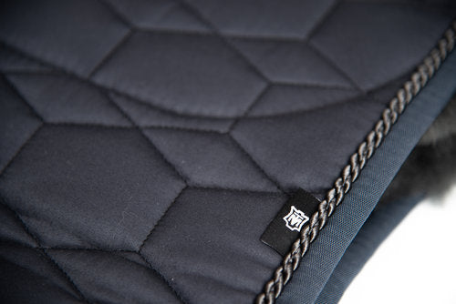 Vierkant dekje met wol aan de onderkant en een sierrand aan de boven- voorkant.