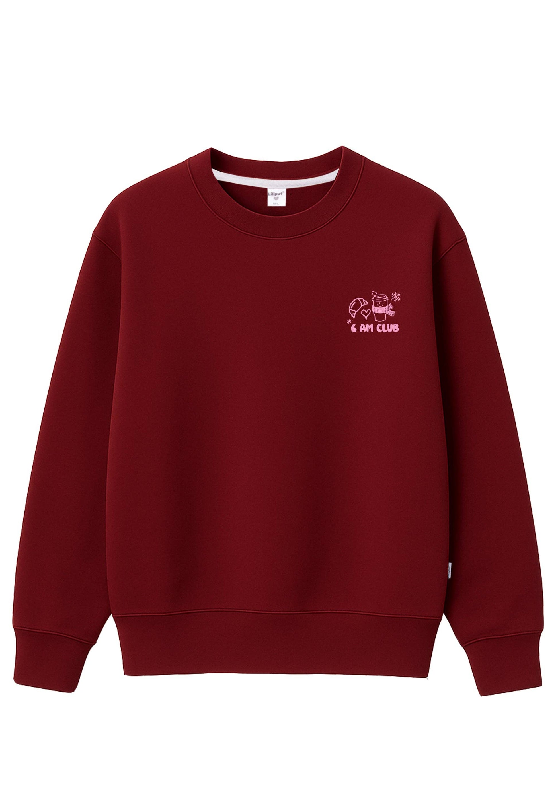 Volwassenen sweatshirt bordeaux 6 am Club Casual, cozy en met veel liefde ontworpen: Onze rode winter sweatshirt komt in een oversized fit met "6 am Club" print aan de voorkant en de uitspraak "Coffee before the cold day begins - every morning 6 am" op de rug. * De mouwen hebben elastische ribboorden. * Oversized fit met verlaagde schouders. Gemaakt van 80% katoen, 20% polyester Ribboorden: 95% katoen, 5% elastaan